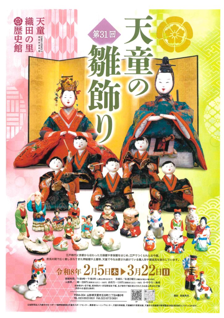 春を告げる企画展「天童の雛飾り」は今回31回を迎えます。江戸時代中期以降盛んになったと言われる雛かざり。ここ天童にも、最上川の舟運や羽州街道を経て天童に伝えられ、大切にされてきたお雛様が数多く残されています。企画展「天童の雛飾り」では、元禄雛や享保雛をはじめ江戸でつくられた古今雛、庶民の間で親しまれてきた押絵雛、土雛等、天童の方々が大切にしてきている雛人形や雛道具を展示してきております。今回は昨年度当館に寄贈いただいた武田家(大町)の雛人形を数十年ぶりに展示させていただいています。また、たくさんの雛人形に加え、雛道具・押絵・竹田人形・御所人形、さらに、天童市出身の工人 湯村正作 氏 の漆芸品や、高擶地区で受け継がれてきた赤白の婚礼衣装もあわせて展示させていただきました。お雛様はそれぞれ、大きさや時代はもちろん、表情や衣装も異なります。しかし、どのお雛様にも、お子様の「誕生の喜び」や「健やかな成長への願い」が込められています。それら受け止めてきたそれぞれのお雛様の歴史を感じながらご覧いただければ幸いです。また、人形・漆芸品・衣裳等に見られる日本伝統の技にも注目して鑑賞いただければと思います。